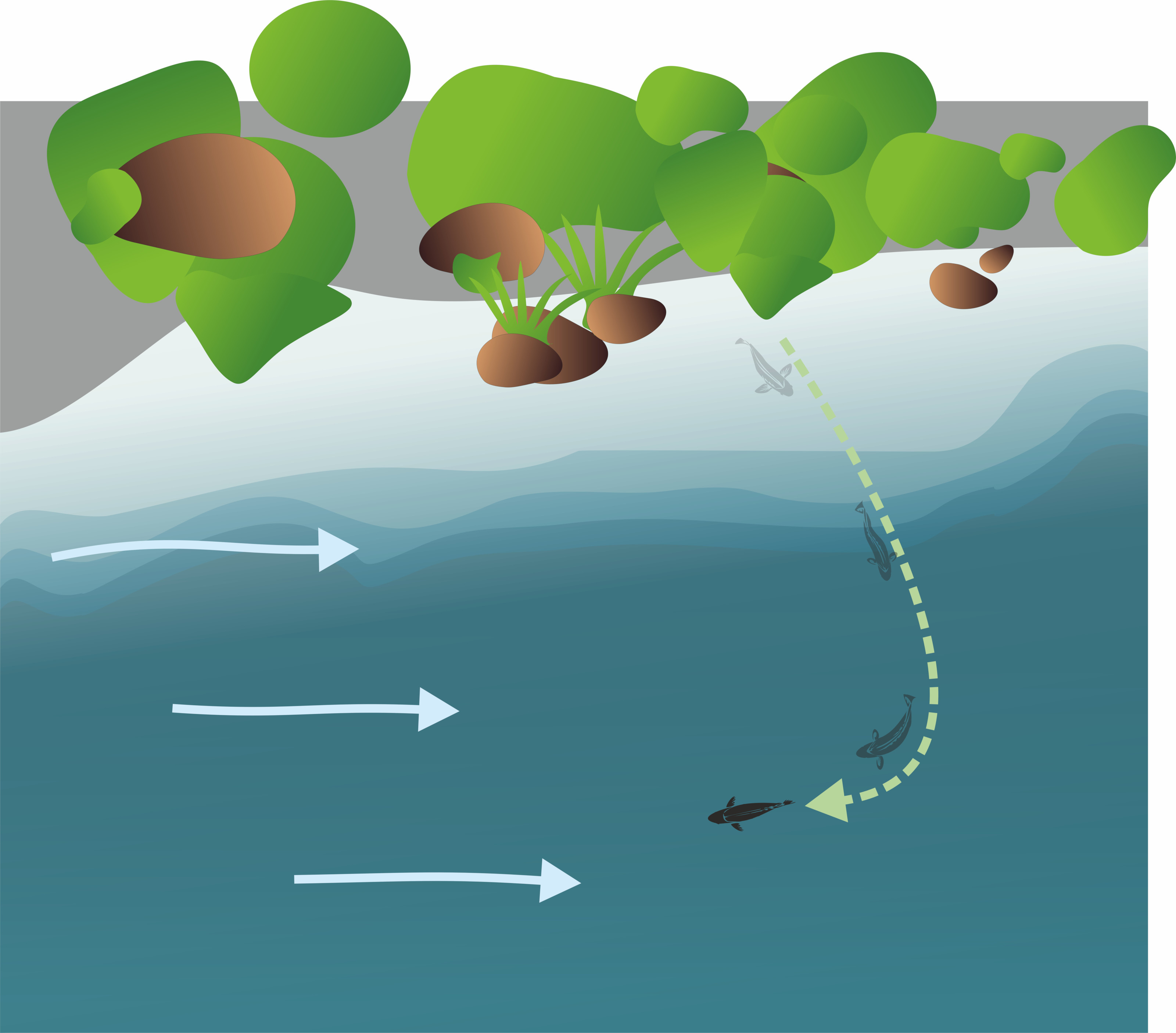 Быстро сместиться в центр реки рыбе удобнее, удирая хотя бы слегка в низ по течению, так как в этом случае струя не разворачивает ее. Таким же образом рыбка будет ловить корм, который уже невозможно перехватить аккуратно смещаясь в сторону.