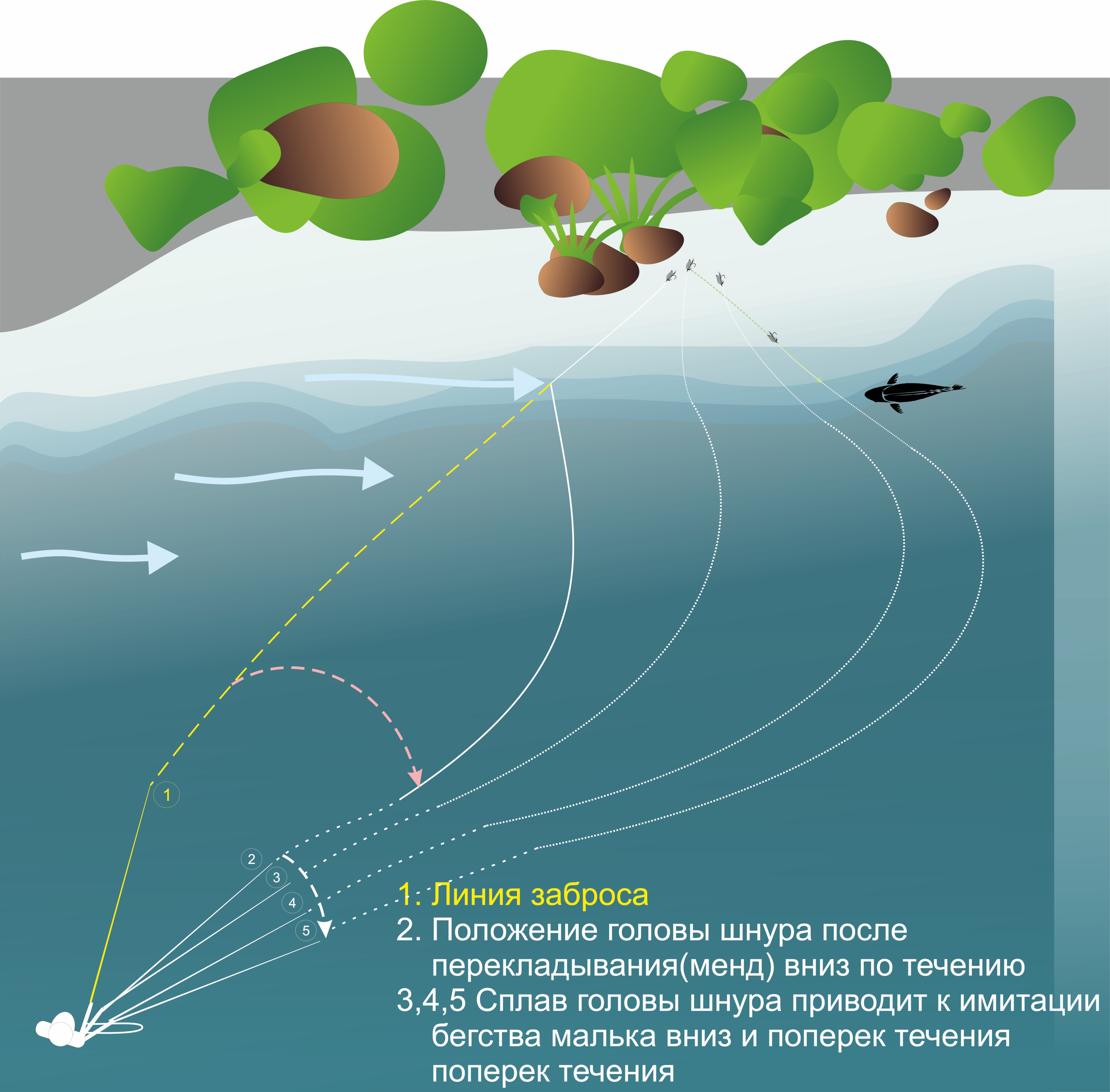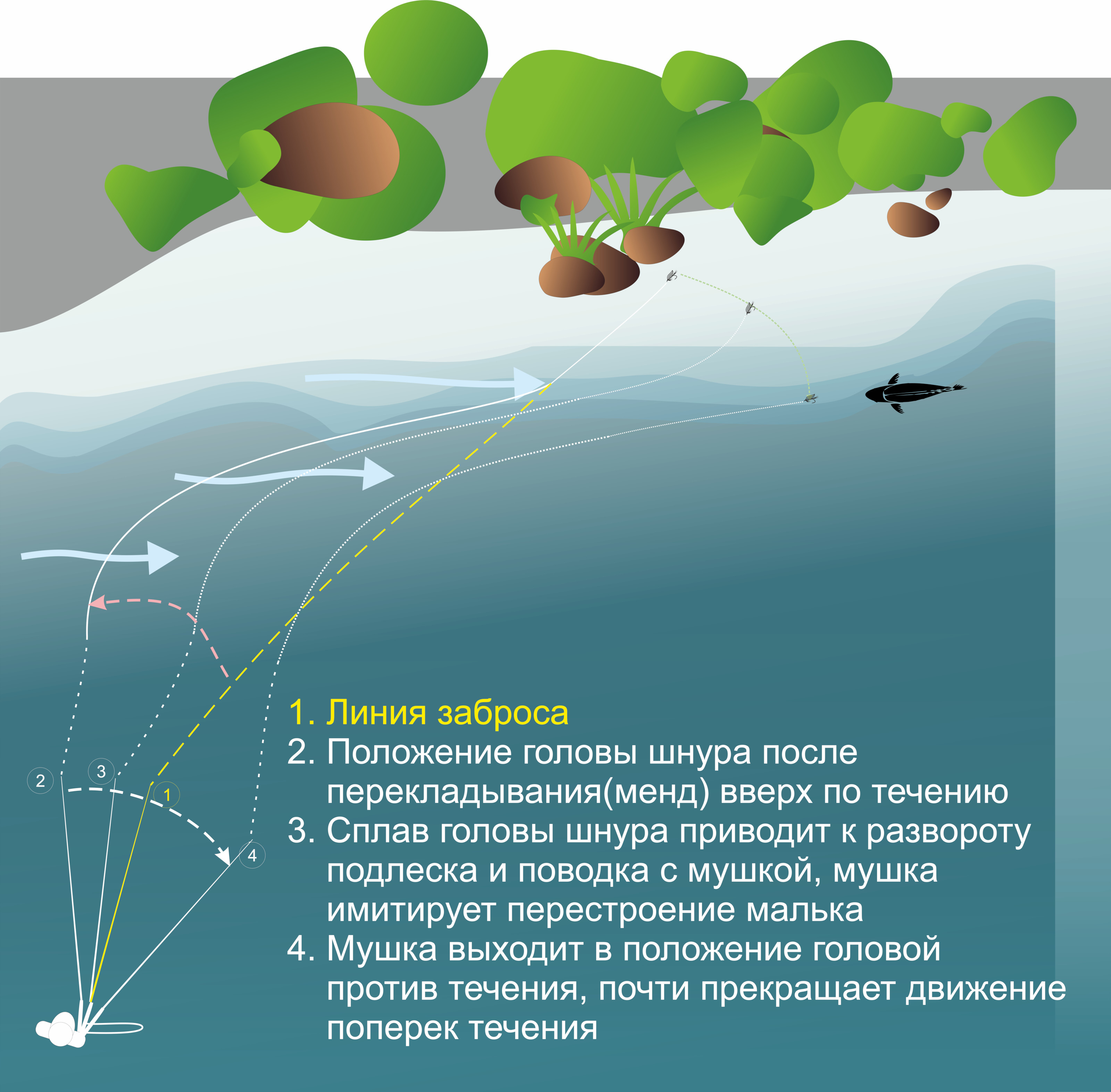 Здесь сразу стоит заметить, что все движения мушки выполняются только тогда, когда вся конструкция — шнур, подлесок и поводок уже натянуты.