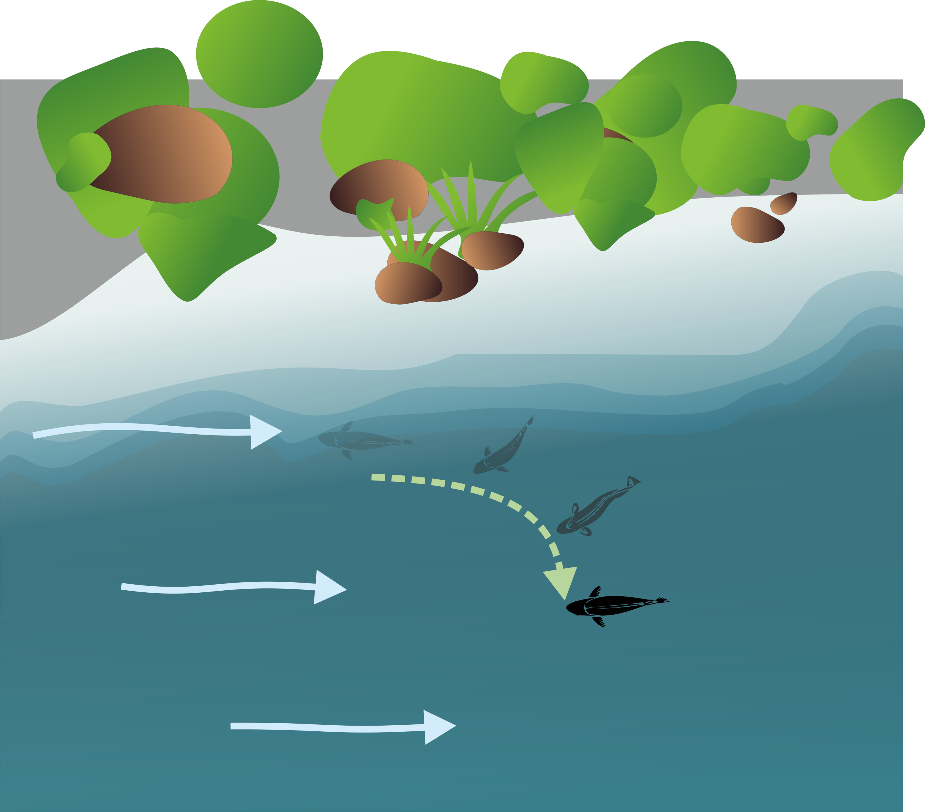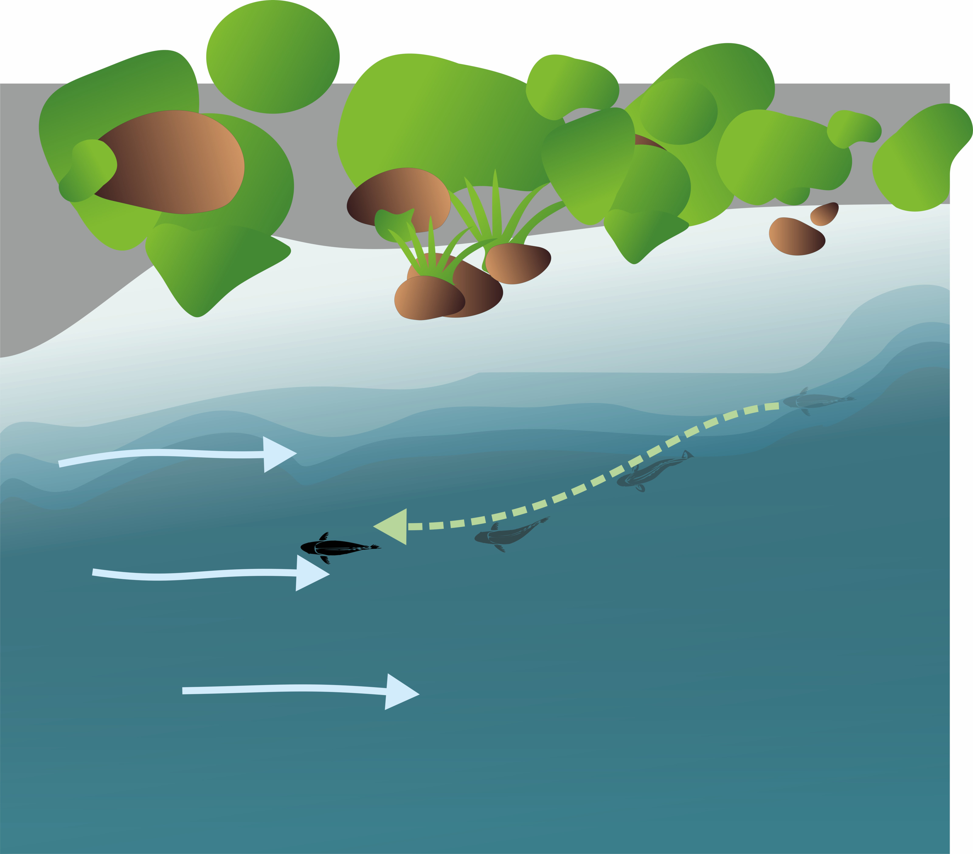 Любая рыба на течении держится вверх по течению головой, вниз хвостом. Она «заднеприводная» с длинным телом, и по другому ей неудобно находиться на струе. При всех своих маневрированиях рыба учитывает течение, так как оно не только мешает ей плыть против него, но и поворачивает ей тело при движении поперек течения.