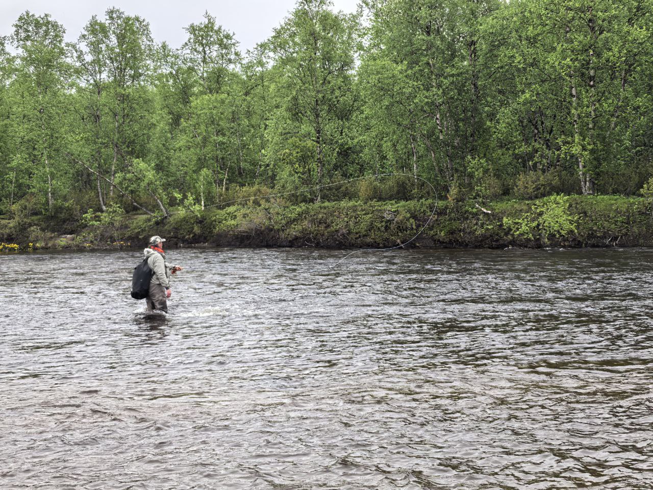 Очень часто у новичков возникает вопрос - а как именно проводить мушку? Надо ли подтягивать шнур во время проводки? Чаще всего не надо. В большинстве случаев выбирание шнура во время проводки (стриппинг) не лучшим образом сказывается на количестве поклёвок сёмги. Это опять же, вполне логично - мушка должна раздражительно приближаться к рыбе. Если же шнур подтягивать к себе, то мушка, сносимая течением к стоянке рыбы, при подтягивании шнура будет одновременно уходить от рыбы по направлению к рыболову. Уходящий объект чаще всего не вызывает агрессивной реакции сёмги, в отличие от обычных хищных рыб. Стрип нужно использовать дозированно и только тогда, когда он необходим - например, в конце проводки у берега на тихом течении, чтобы мушка не "заваливалась" назад (часто у мушек на трубках на тихом течении крючок перевешивает и мущка перестаёт занимать горизонтальное положение, при этом меньше привлекает рыбу). Или же при ловле по высокой воде с тонущими шнурами опять же у берега на слабом течении придётся стриповать, чтобы не позволить мушке зацепиться за дно, но при этом максимально долго удерживать её в зоне предполагаемой стоянки рыбы. Также стрип может помочь при ловле по малой воде на мелкие мушки при тихом течении. Но об этом позже. Пока главный вывод - надо постараться определить стоянку рыбы и подать мушку так, чтобы её сносило мимо стоянки течением, прибивая к берегу. При этом лучше никаких "посторонних" движений не делать.