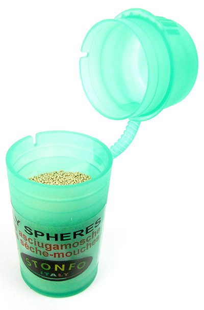 . Это белый порошок с сильными абсорбирующими свойствами, который быстро впитывает оставшуюся в мушке воду, по сути, высасывая её. Лучше всего насыпать немного порошка на крылья и/или тело мушки и растереть его пальцем. Сдуйте излишки порошка и при необходимости повторите процедуру. Лучше всего держать мушку за крючок между пальцами. Если окунуть мушку в порошок целиком, то сам крючок, скорее всего, всплывёт, и мушка перевернётся. Кроме того, если окунуть мушку в порошок целиком, то часть его может попасть на леску, что может повредить леску о край контейнера и негативно сказаться на будущей рыбалке.