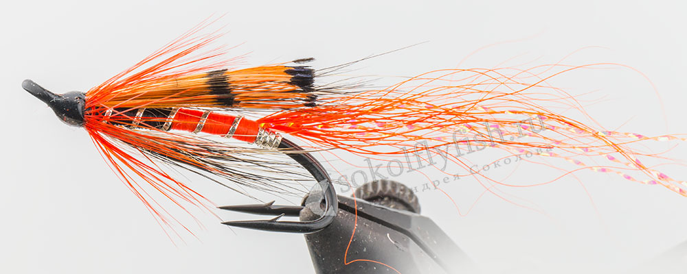 Я бы не сказал, что точная имитация креветки делает мушку более уловистой для сёмги. Попытки сделать более точную имитацию креветки на основе мушки General Practitioner или Ally`s Shrimp путём формирования конического тела, креветочных круглых глазков сзади - не даёт бонуса к уловистости . Не говоря уж о том, что ярко-оранжевая имитация варёной креветки изначально не имеет реалистичности – в море креветки имеют серый, коричневатый, иногда с зеленоватым отливом цвет. Это камуфляжная расцветка под цвет песчаных морских отмелей, являющихся местами нагула сёмги. Глубоководную креветку не рассматриваем, так как она обитает на глубинах, недоступных для сёмги. Итак, в лососевых мушках реалистичность не важна, эта рыба не питается в реке. Нельзя сказать того же о мушках для морской кумжи – здесь реалистичность имитаций такого корма, как креветки или рыбки песчанки дают ощутимый эффект, поэтому обычно мушки имеют серые, зеленоватые и коричневые расцветки и достоверный силуэт типичного для этой рыбы корма. Поэтому ярко-оранжевую мушку с контрастными чёрными элементами я скорее отнёс бы к группе ярких провоцирующих мушек General Attractors. Наилучшую уловистость эти мушки демонстрируют в воде с торфянистым оттенком, что делает их довольно универсальными на Терском Берегу Кольского. На Северном берегу это типичная весенняя мушка для ловли активной рыбы по высокой и второй воде. По малой воде в солнечную погоду работает в самых маленьких размерах, часто с проводкой поперёк течения со стрипами.