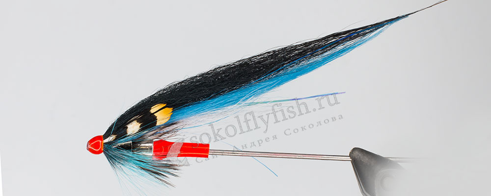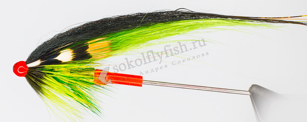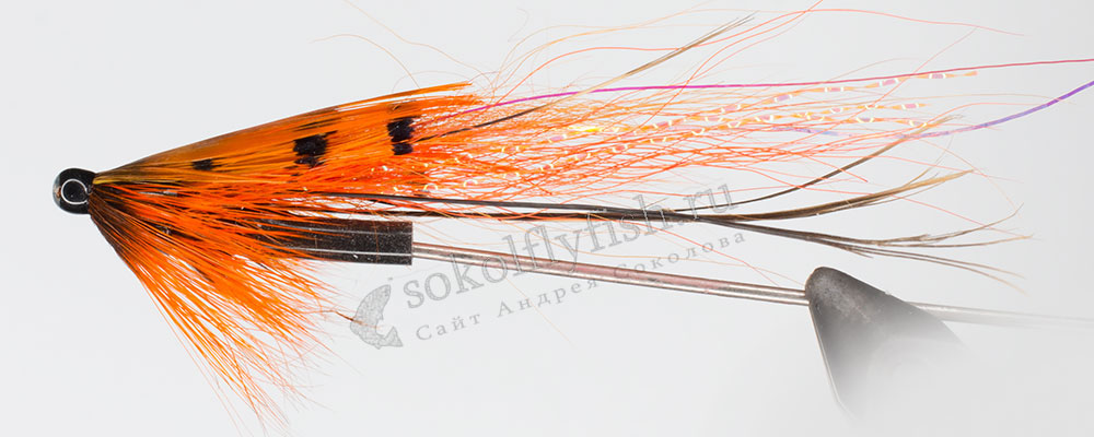 Мушка SunrayShadow. Очень простая крупная мушка на трубке, с длинным крылом.Лучше всего работает при активной проводке – в разгон, со стрипами. Заброс чаще всего поперёк реки. Эта мушка должна решительно и «нахально» вторгаться в «личное пространство» сёмги, вызывая уверенную ответную агрессию.
