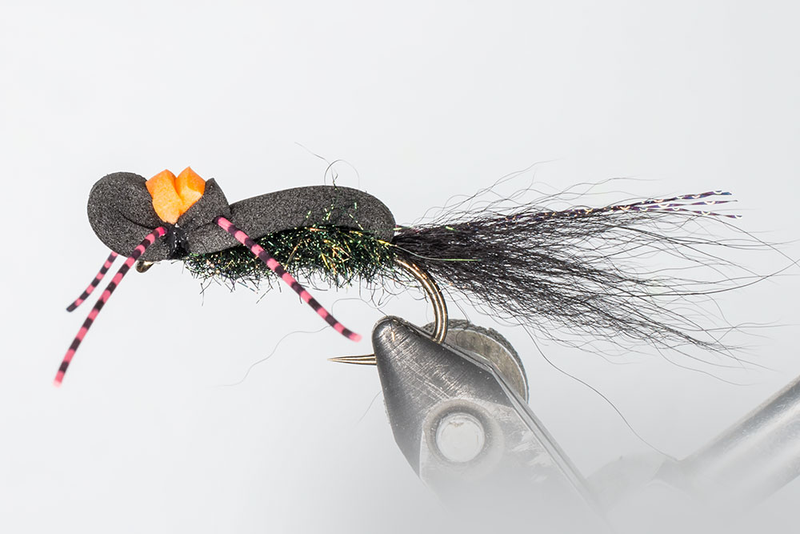 Вариант мушки General Practitioner – типичная весенняя мушка для высокой воды, яркая и контрастная (обратите внимание на чёрные детали на оранжевом фоне). Чёрные «усики» из жёсткой кабаньей щетины создают дополнительную вибрацию в потоке.