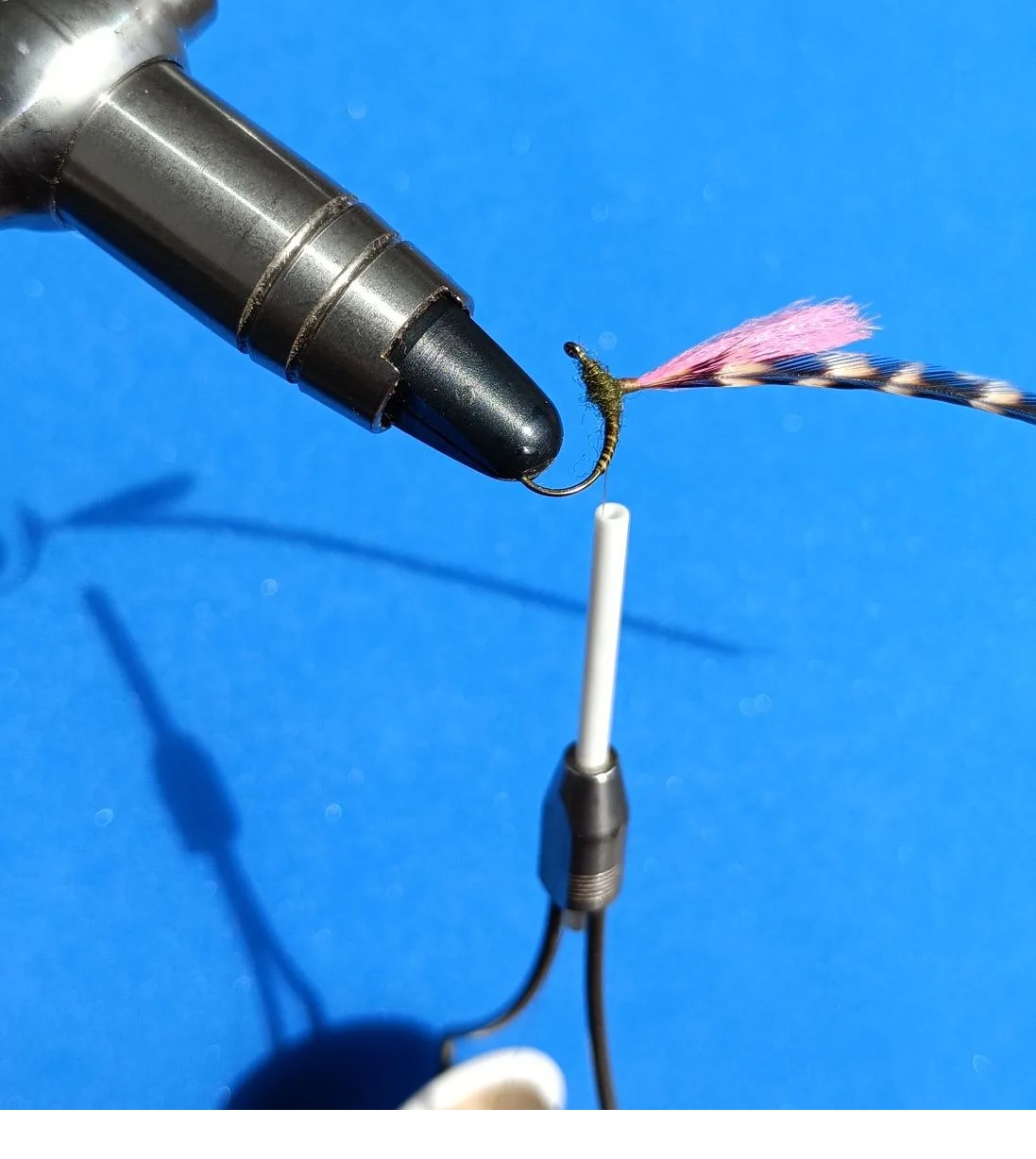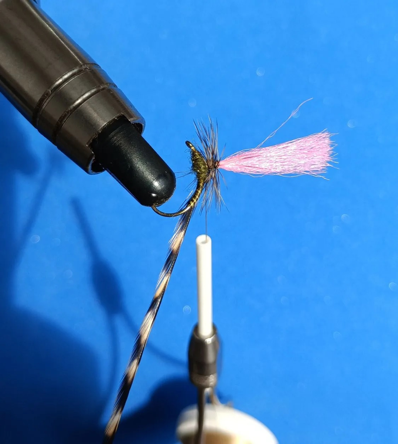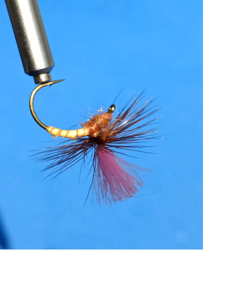 Одна из сухих мушек, которая обязана быть в коробочке нахлыстовика - Эмержер (Emerger) с парашютиком. Вот и Руслан подвязал к сезону своих любимых "сухариков". Вариант тела из индюшиных биотов оливкового цвета и второй вариант цвета Fl. Orange, перо петуха гризли или коричневый гризли, даббинг Antron. Индюшиные биоты мягче и длиннее гусиных.