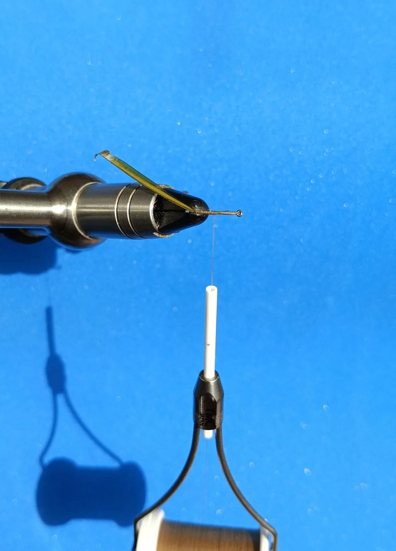 . Эта мушка имитирует: РУЧЕЙНИК (Trichoptera) / Всплывающая куколка (Pupa), горизонтально расположенная обмотка пером петуха создает опору на воду мушки. Рыба видит ее снизу и расплывчатое "пятно контакта" на поверхности воды весьма реалистично имитирует насекомое. А индикатор сверху очень хорошо заметен нахлыстовику. Перед ловлей обработайте парашютик и ершик (но ни в коем случае не загиб и поддев крючка) флотантом. Положить эту мушку на воду следует весьма аккуратно и обеспечить некий проплыв без воздействия на мушку шнура и поводка (например "змейкой"). Поклевка не заставляет себя ждать и всегда очень зрелищна. Пошаговое исполнение понятно по фотографиям. Ножку на индикаторе формируем монтажной нитью плотную 1,5 мм, чем плотнее, тем легче потом делать на ней ершик пером - 3-4 оборота. Окончательно закрепляю перо и финишный узел тоже формирую на этой ножке. Не забываем покрыть узел финишным лаком.