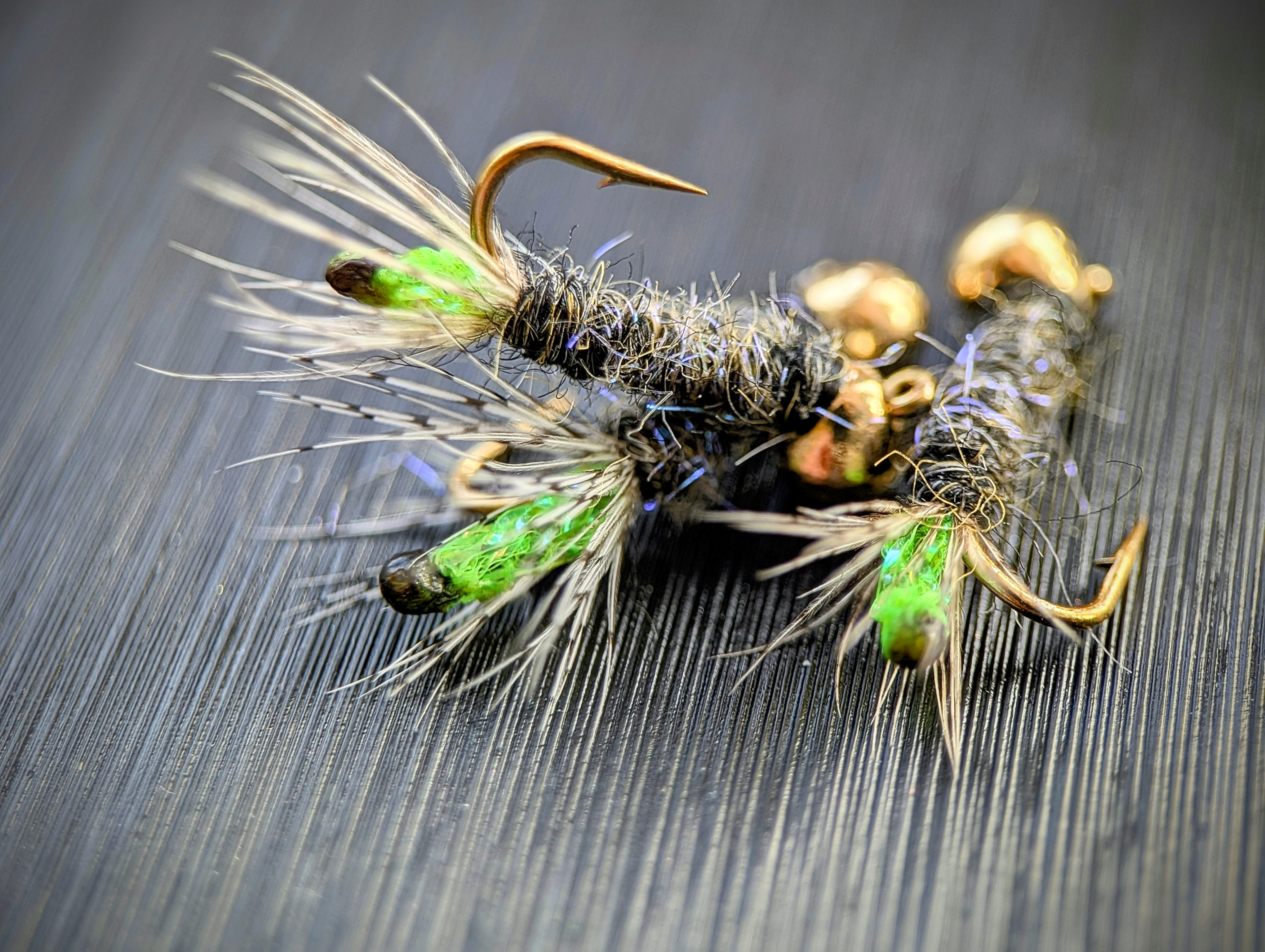 Вариант №1. Яркое, заметное тело ручейника в сочетании с ножками из куропатки. По телу смесь оленя + UV даббинг + даббинг Peacock, что даёт блеск на домике, как имитация воздушных пузырьков. Всё это делает мушку привлекательной для рыбы.