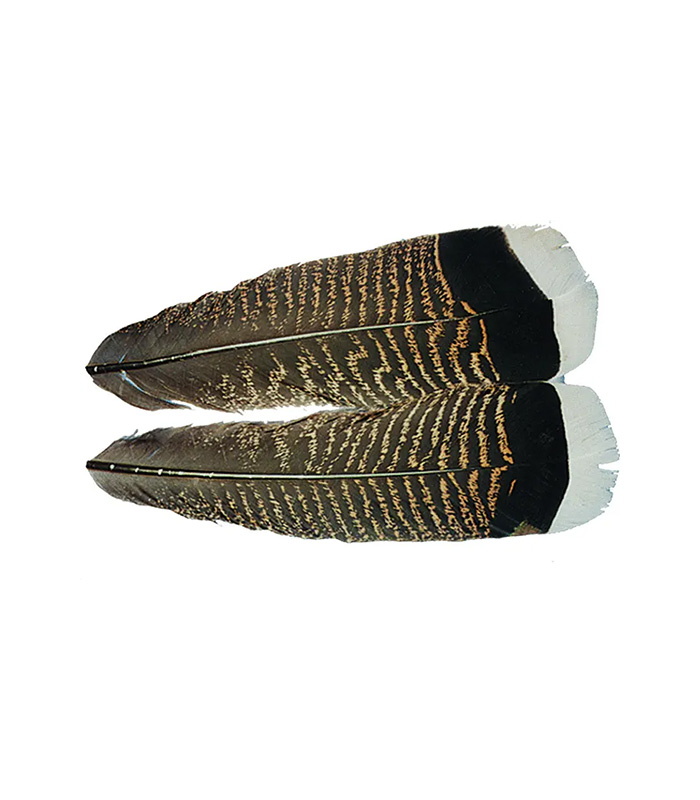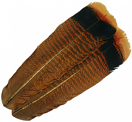 Хвостовые перья индейки - традиционный материал для классических лососевых и форелевых мушек. Хвостовые перья индюка, в отличие от маховых, практически симметричны относительно ости пера, благодаря этому пару крылышек одной мушки можно вязать из вырезов одного хвостового пера. Вырезы и бородки годятся для изготовления ножек, хвостиков, чехлов зачатков крыльев.