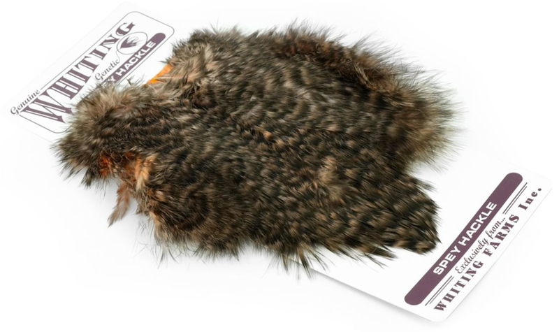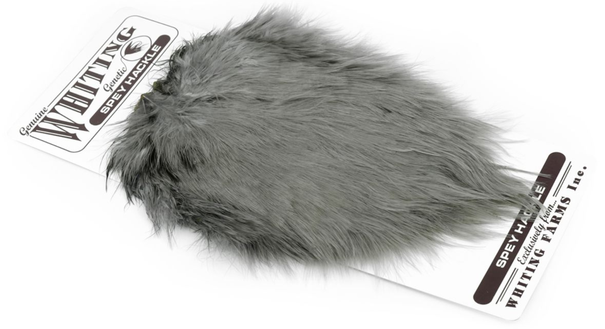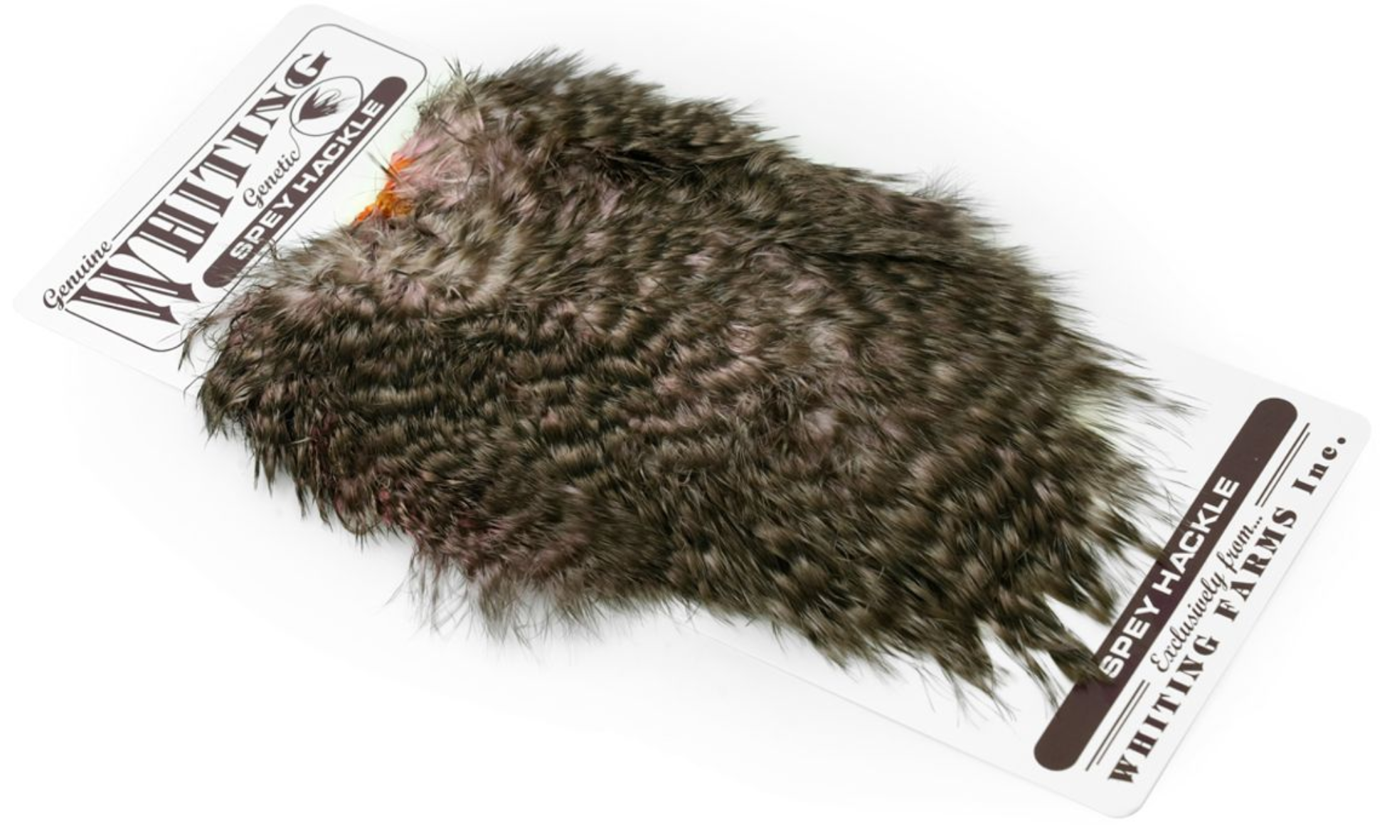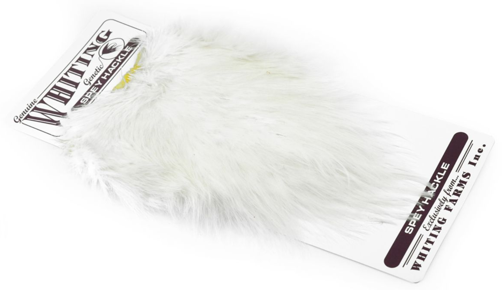 Instigating a number of genetic avenues, development proceeded towards a “genetic” Spey Hackle, which then became available after about 5 years of initial selection work. Feather characteristics sought included long, substantial barbs, absence of any webbing between the barbs, non brittleness of the entire feather and excellent density for good value. In addition to a pure white, which is deal for dying, an array of other color and pattern genes were incorporated into this “genetic” Spey hackle stock. Thus new and unusual feather colors and patterns would be available to encourage the inherent creativity of fly tiers. A wide range of feather sizes will also be available from these “genetic” Spey hackle chicken, thus allowing an even wider range of fly sizes to be tied.