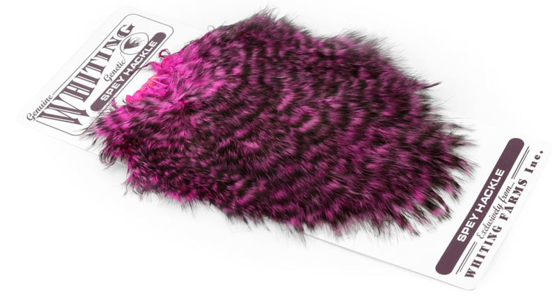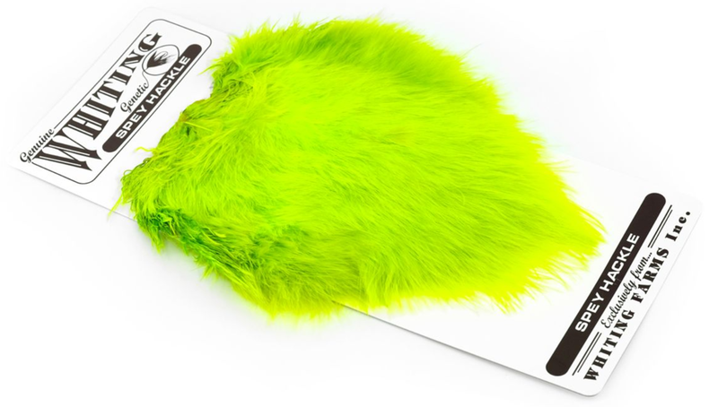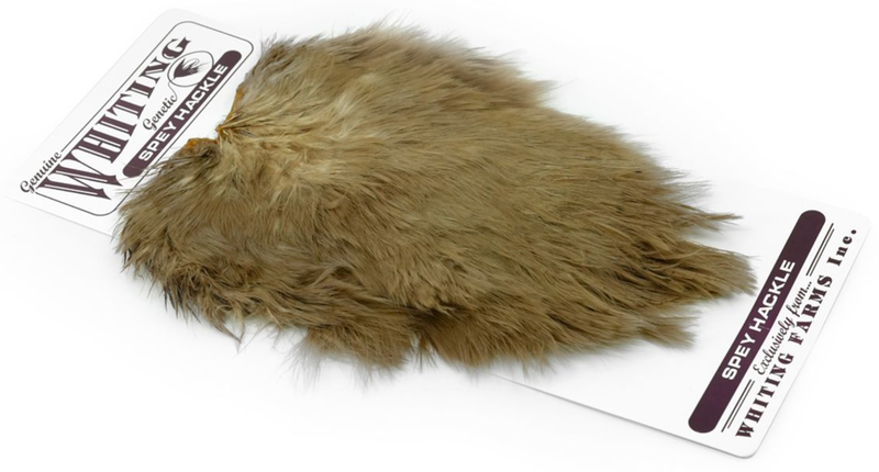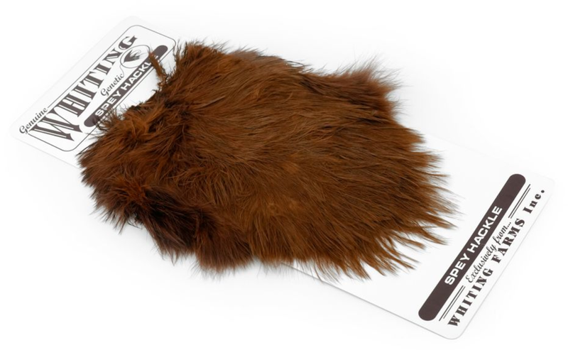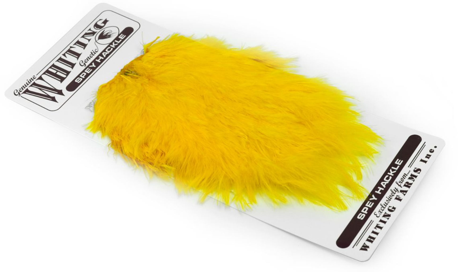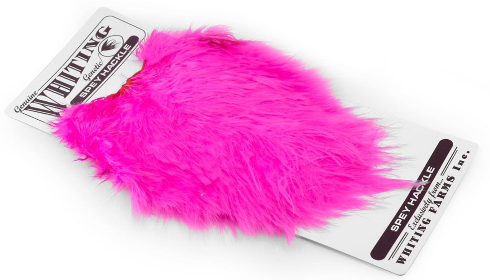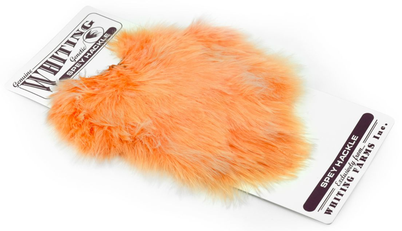 Instigating a number of genetic avenues, development proceeded towards a “genetic” Spey Hackle, which then became available after about 5 years of initial selection work. Feather characteristics sought included long, substantial barbs, absence of any webbing between the barbs, non brittleness of the entire feather and excellent density for good value. In addition to a pure white, which is deal for dying, an array of other color and pattern genes were incorporated into this “genetic” Spey hackle stock. Thus new and unusual feather colors and patterns would be available to encourage the inherent creativity of fly tiers. A wide range of feather sizes will also be available from these “genetic” Spey hackle chicken, thus allowing an even wider range of fly sizes to be tied.
