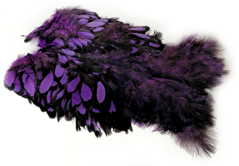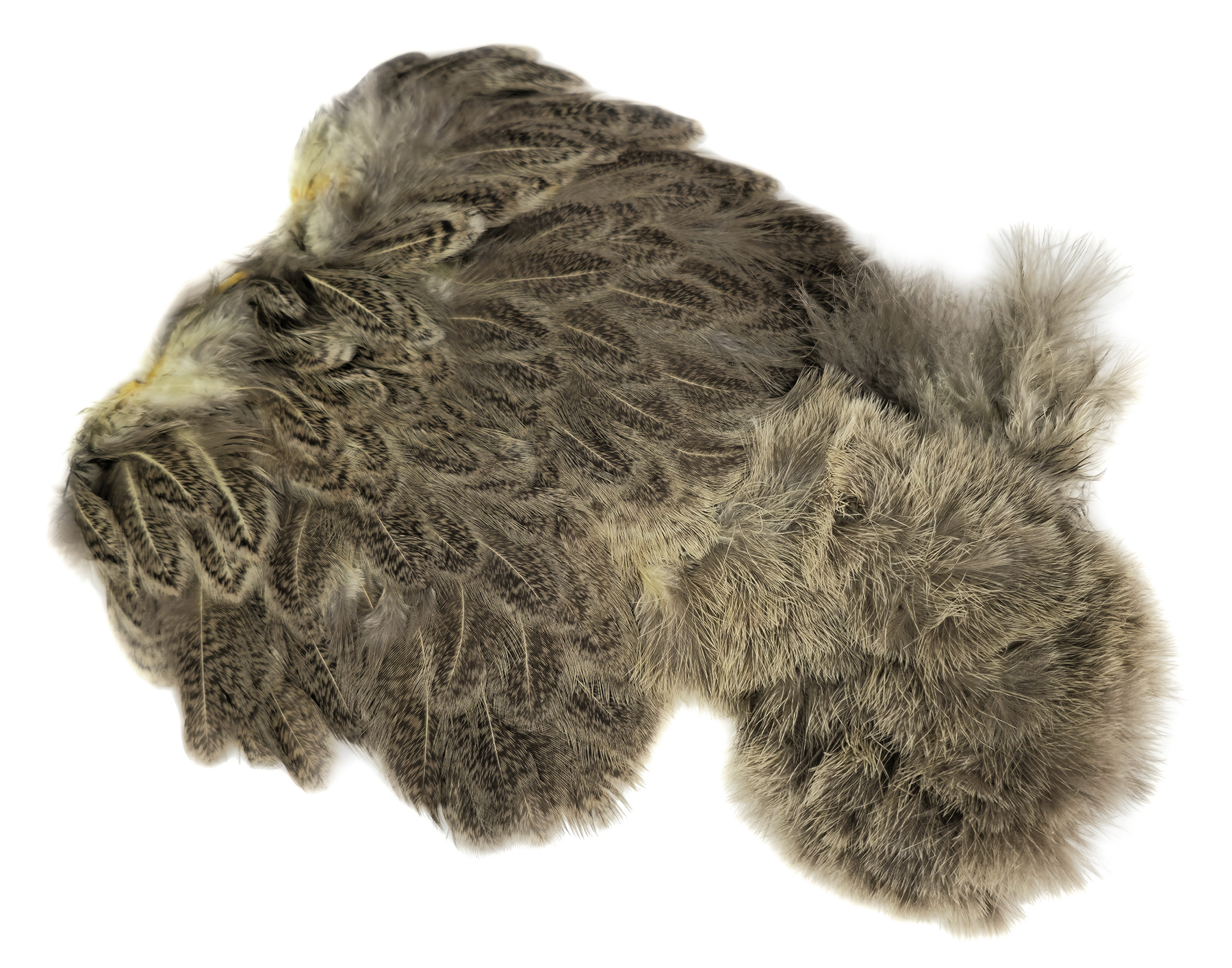 Soft Hackle: The Top portion of the pelt contains two panels of full web, Matuka type, wet fly feathers. The feathers on either panel are mirror images of one another and so can be paired for balanced opposing sides of the fly. These feathers, when used full, are ideal for Matuka and Sculpin flies. They are also great for shorter tarpon and saltwater flies, and full feather bass and panfish flies. They are also excellent for wrapped hackle applications for steelhead and salmon flies.
