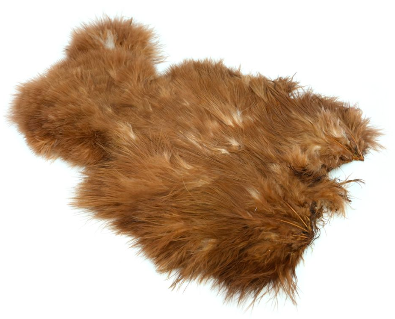 The marabou-like feathers at the narrow end of the pelt are what we named he at Whiting Farms; Chickabou. They are much finer and more delicate than traditional turkey marabou, which tends to be too large and coarse for many flies. And because it’s from a chicken numerous patterns and markings are available to enhance its effectiveness, particularly grizzly and grizzly dyed olives, brown and bright colours.