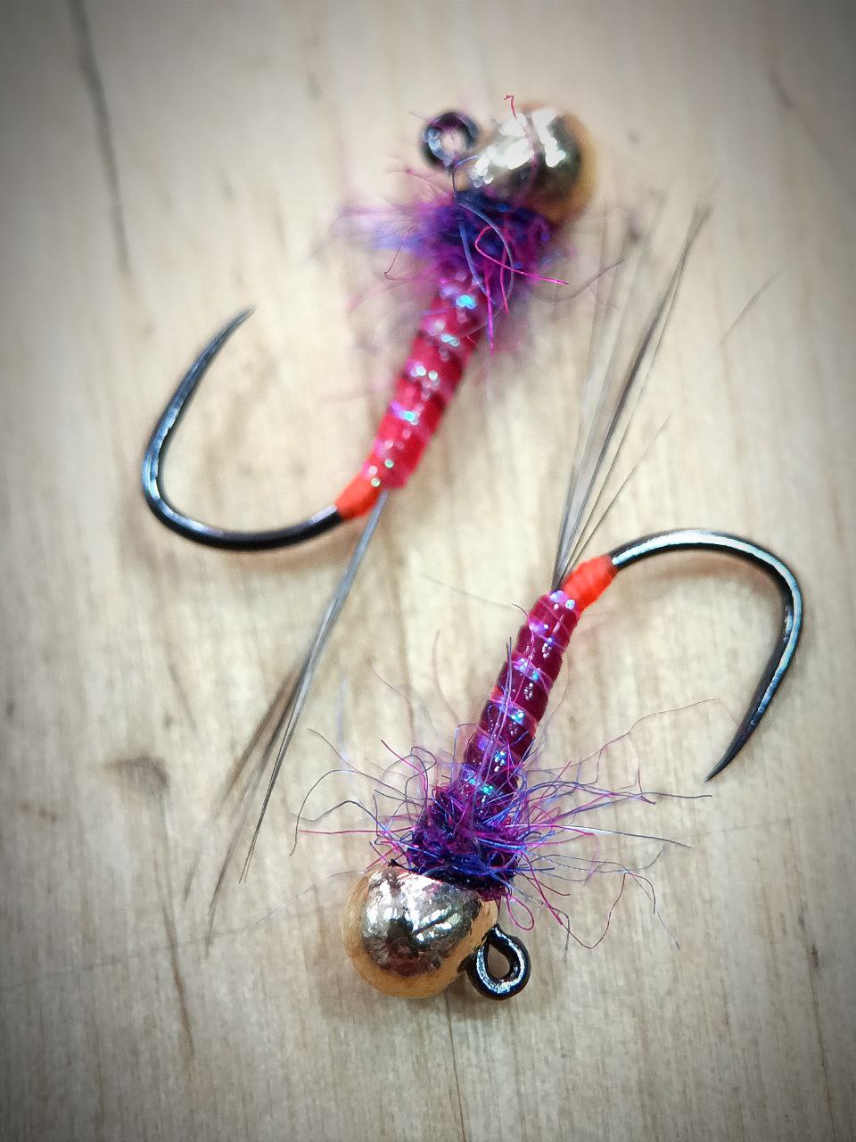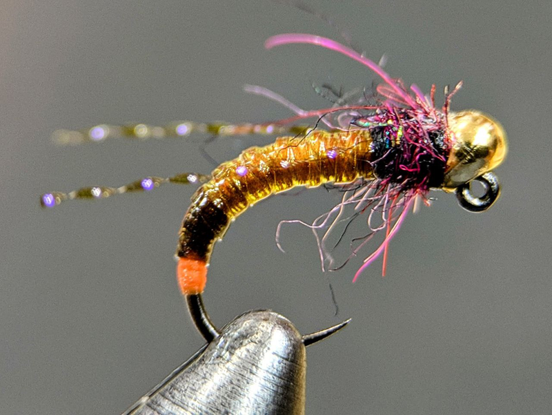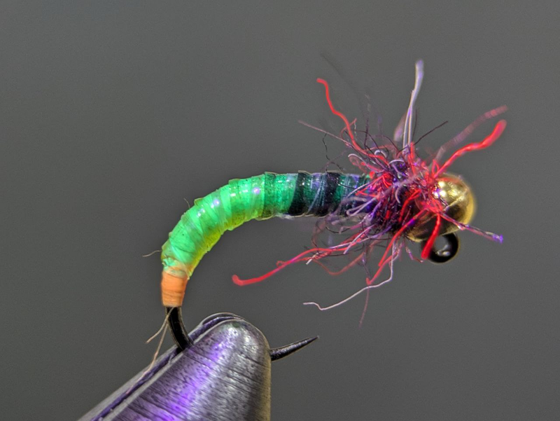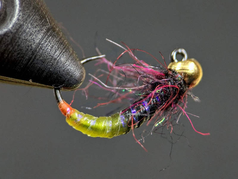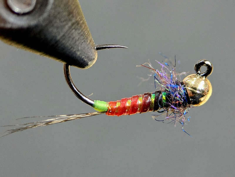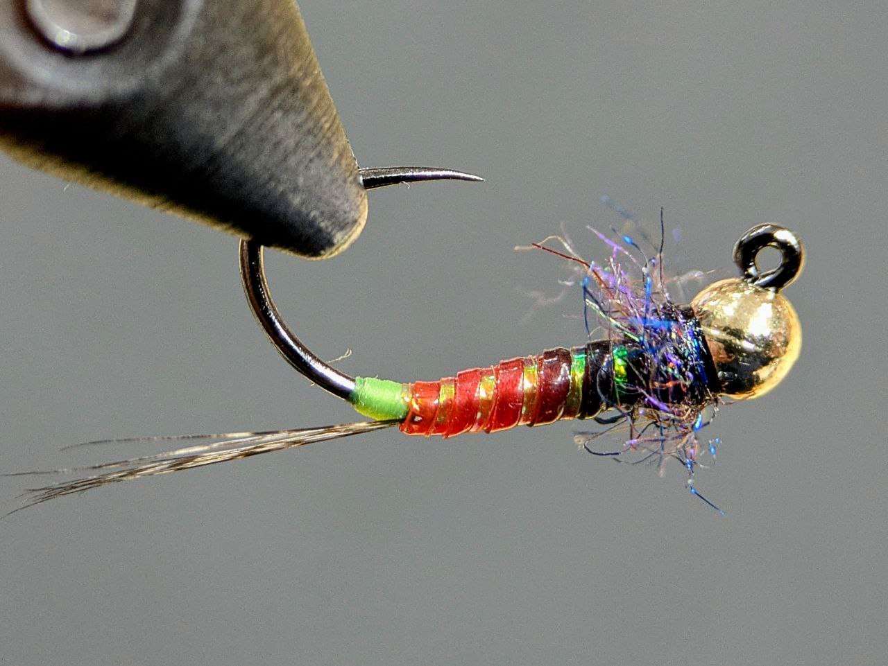 Интересная мушка: Нимфа подёнки с полупрозрачным блестящим эффектом и чёткой, контрастной сегментацией . Сегментация тела достигается за счёт TEXTREME Пленка для формирования тела SYNTHETIC BIOT. Плёнка полупрозрачная различных оттенков. Но за счёт изменения цвета подложки под плёнку можно достигать различных эффектов. В этом варианте мушки подложка тела делается из из различных оттенков Rainbow тесьмы GLITTER THREAD. Ну, или других цветов по желанию. Разумеется, как вариант возможно применение и ярких цветов тесьмы BODY FLY PEARL Поверх подложки затем с шагом наматывается плёнка SYNTHETIC BIOT. В итоге у вас получается тело с чёткой сегментацией и с полупрозрачным внутренним блеском. Такой эффект хорошо привлекает рыбу.