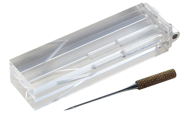 Приспособление позволяет соединить шнур и подлесок без петель и коннекторов. Это бывает удобно, когда порвалась заводская петля или слетел коннектор. Место соединения получается очень аккуратным и компактным. В устройстве предусмотрены два отверстия (для разных классов шнуров). Инструкция прилагается.